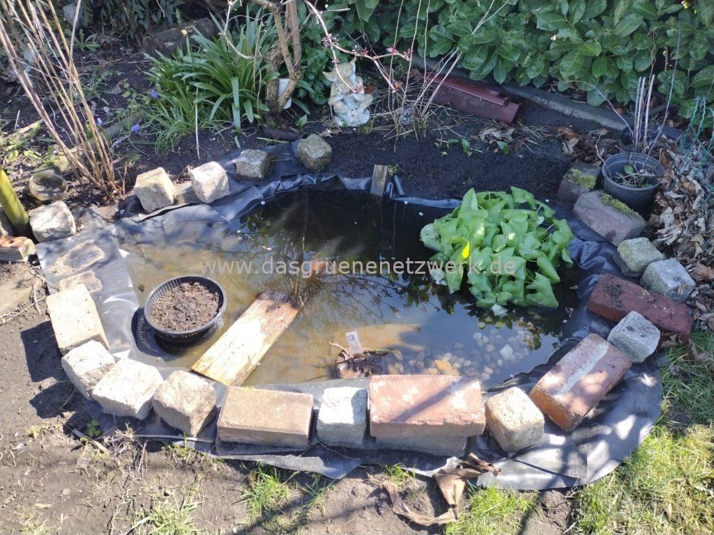 Apropos Teich. Wir haben eine kleine Vergrößerung vorgenommen und jetzt noch Brunnenkresse (links) und Tannenwedel( noch nicht aufgetaucht) gepflanzt. In der Gärtnerei musste ich mich dann für Wasserfenchel oder Fieberklee entscheiden und da ich weiß, dass der letztere als bedroht gilt, ist er auch bei uns eingezogen. Foto folgt.