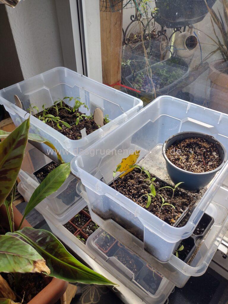 Aussaat erfolgt am Anfang in Platten und ich pikiere zeitnah entweder in die nächste Reihe oder sofort in einen Topf, der dann auch wieder in eine Kiste mit Deckel umzieht. Die Kisten sind stapelbar, aber die Pflanzen sollten jeden Tag gedreht und vorsichtig gelüftet und gegossen werden.
