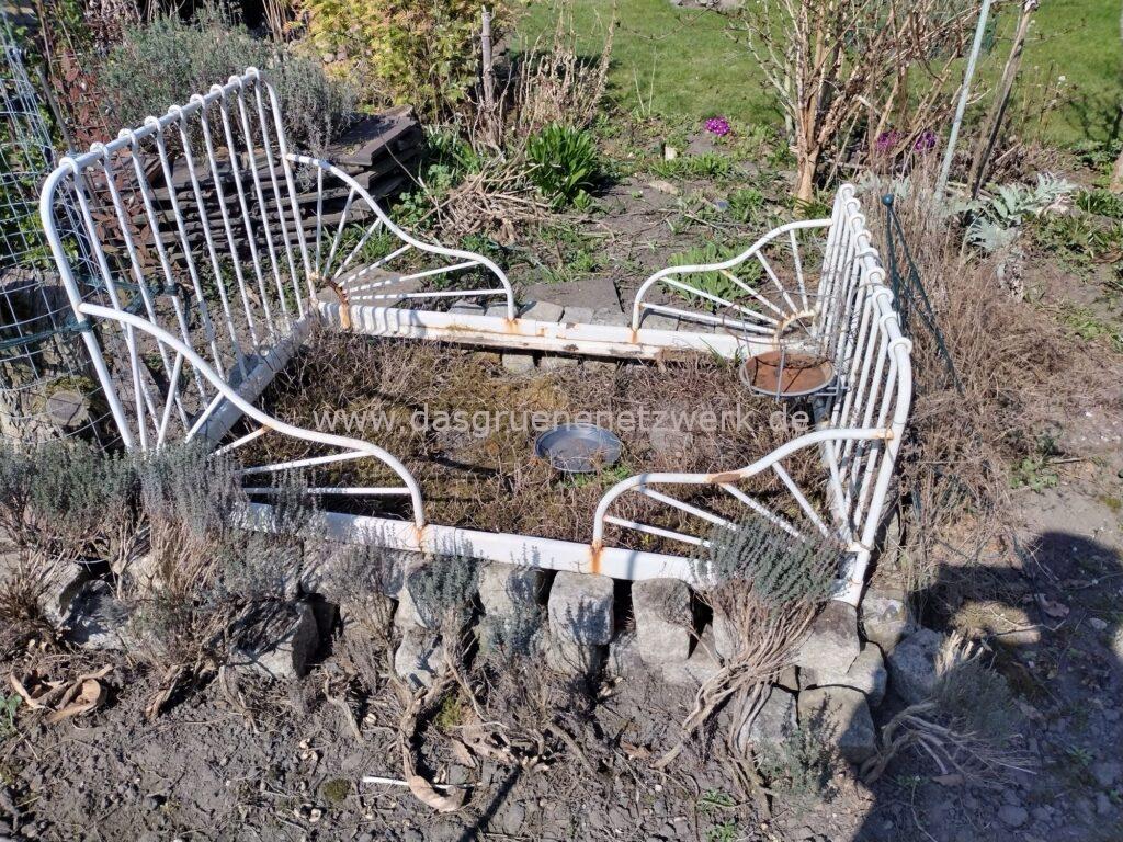 Das Bett ist übrigens auch aus den Kleinanzeigen (20€) und wird – neu- von einem schwedischen Möbelhaus angeboten. Ich wollte erst ein normal großes Bett kaufen und habe in der Anzeige gar nicht drauf geachtet wie groß oder klein das ist. Ich fand das einfach nur schön! Es ist ein ausziehbares Kindermetallbett und die Größe passt besser in der Garten. Glück gehabt 😉