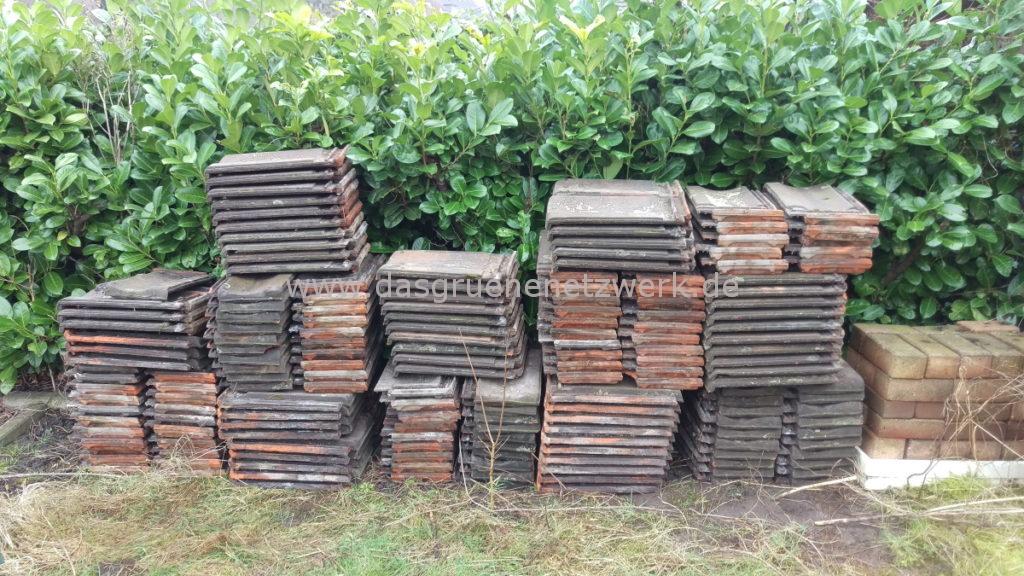 Wurden auch noch einige alte Dachziegel gerettet (211 Stück…) und damit Dachziegelhaufen zur Eck-Begrenzung unseres Kräutergartens gebaut. Und natürlich können sich dort auch Nützlinge und wer-auch-immer verstecken.