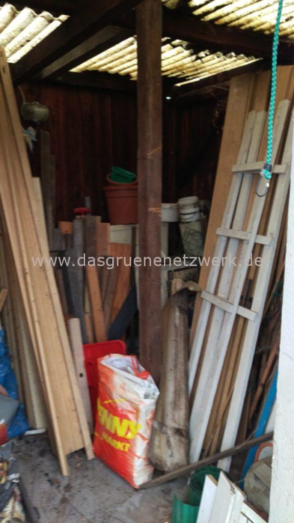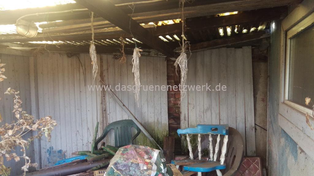 Als das Schlimmste im Beet überstanden und die Pflanzen umgesiedelt waren, ging es an die Laube. Es mussten noch einige Auflagen erfüllt und der linke Teil komplett abgerissen werden.