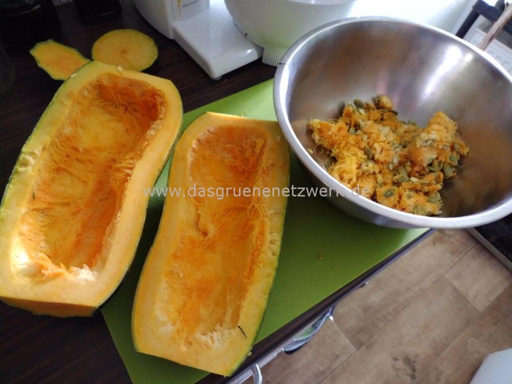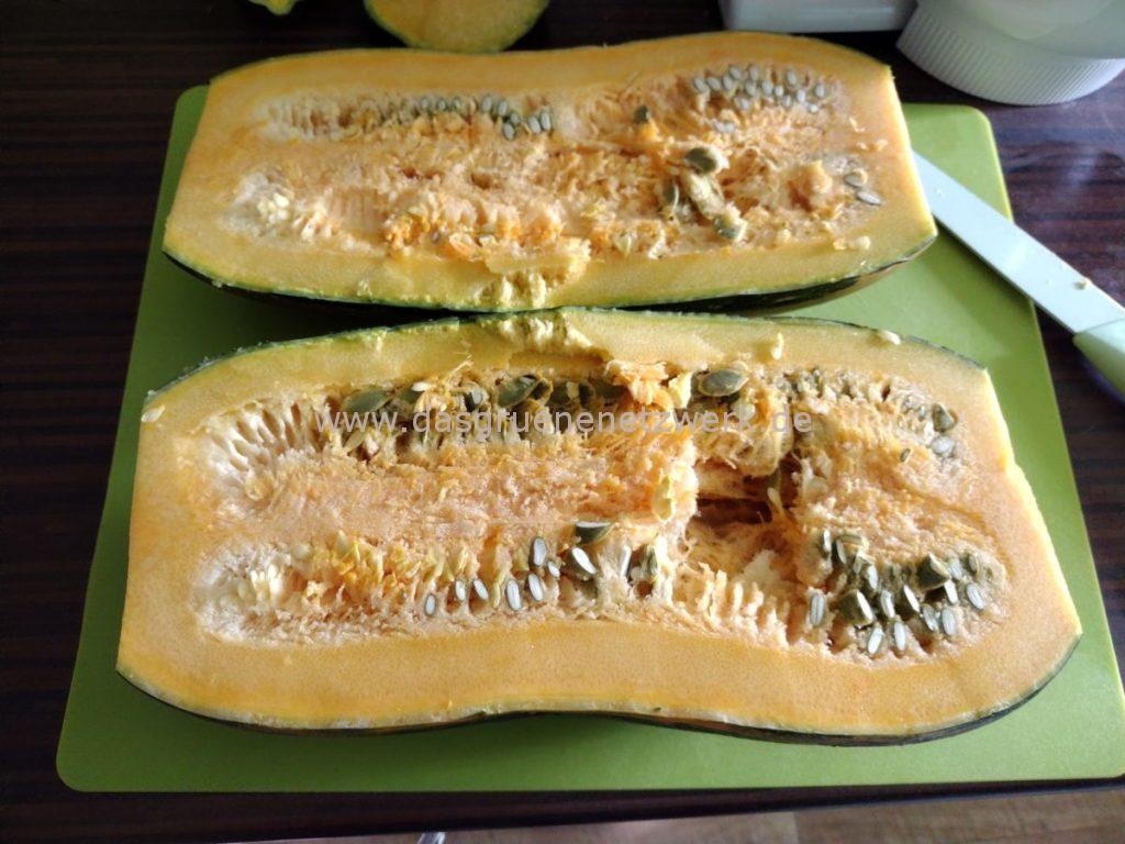 Was mir beim Aufschneiden ebenfalls aufgefallen ist: Die Schale ist sehr fest und das Fruchtfleisch ist etwas Spaghettikürbis ähnlich.
