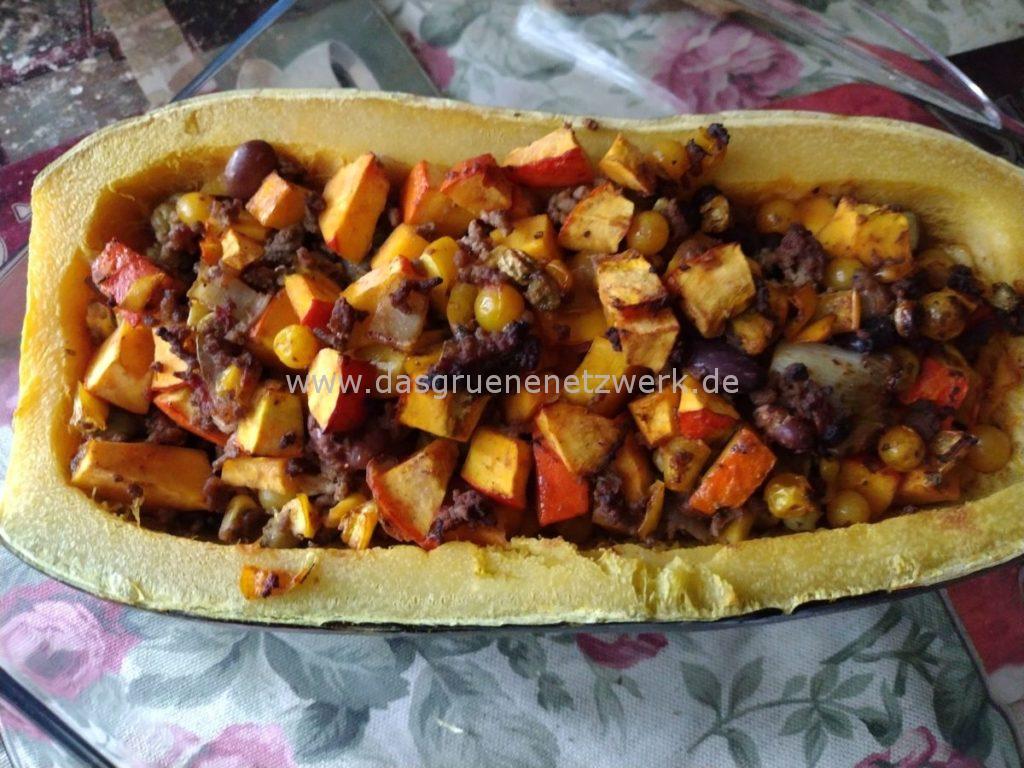 Zucchinischiffchen gefüllt mit Hokaido, etwas Chili Con carne Resten vom Vortag und Johannisbeertomaten ( ebenfalls aus dem eigenen Garten und auch ein heißer Tipp)