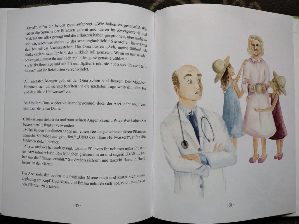 Die beiden Mädchen stehen zweifelnd vor einem Rosenbusch und reden mit ihm, aber es kommt keine Antwort. Die Mädchen hatten die Geschichte schon fast vergessen als ihre Oma krank wird und kein Arzt ihr helfen kann. Sie bittet ihre Enkeltöchter um Hilfe und gibt ihnen einen magischen Fliegenpilzanhänger, mt dem sie die Sprache der Pflanzen verstehen können.