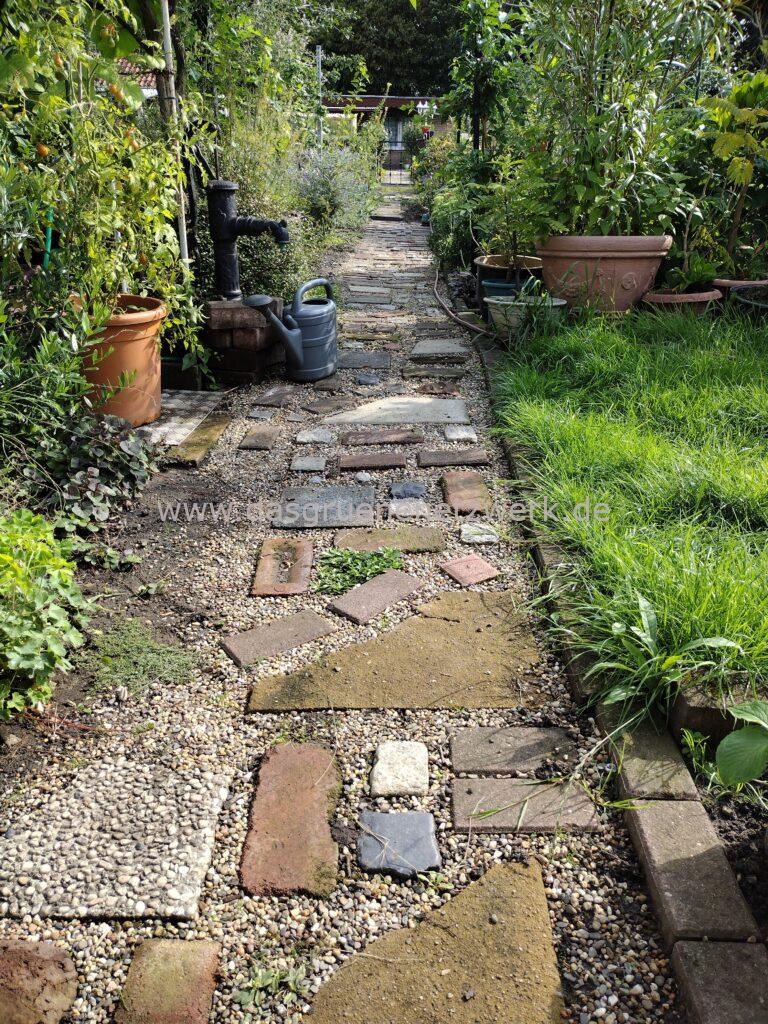 Statt Mähen und Zupfen werden wir den Weg neu gestalten und mit pflegeleichten, trittfesten Stauden begrünen! Verwendet werden die alten Gehwegplatten, Ziegel, Granitsteine und Co.